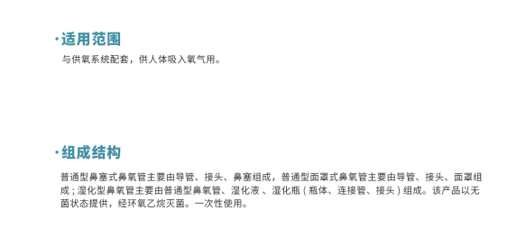 普通型鼻塞式鼻氧管主要由導(dǎo)管、接頭、鼻塞組成;普通型面罩式鼻氧管主要由導(dǎo)管、接頭、面罩組成;濕化型鼻氧管主要由普通型鼻氧管、濕化液、濕化瓶(瓶體、連接管、接頭)組成。
