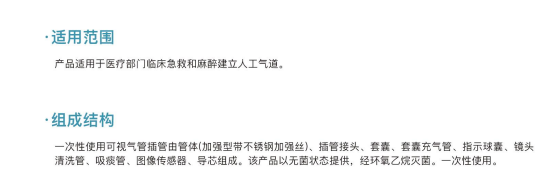 一次性使用可視氣管插管由管體(加強型帶不銹鋼加強絲)、插管接頭、套囊、套囊充氣管,指示球囊、鏡頭清洗管、吸痰管、圖像傳感器、導(dǎo)芯組成。該產(chǎn)品以無菌狀態(tài)提供,經(jīng)環(huán)氧乙烷滅菌。一次性使用。