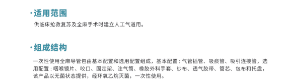 一次性使用全麻導(dǎo)管包由基本配置和選用配置組成,基本配置:氣管插管、吸痰管、吸引連接管,選用配置:咽喉鏡片、咬口、固定架、注氣筒、橡膠外科手套、紗布、透氣膠帶、管芯、包布和托盤。產(chǎn)品應(yīng)無菌。