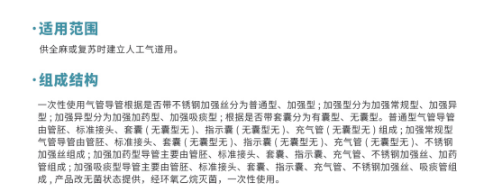 一次性使用氣管導(dǎo)管根據(jù)是否帶不銹鋼加強(qiáng)絲分為普通型、加強(qiáng)型;加強(qiáng)型分為加強(qiáng)常規(guī)型、加強(qiáng)異型;加強(qiáng)異型分為加強(qiáng)加藥型、加強(qiáng)吸痰型;根據(jù)是否帶套囊分為有囊型、無囊型。